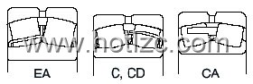 調心滾子軸承,如圖所示,有高負荷容量設計的EA型,C型,CD型,CA型。設計上, EA型,C型,CD型 為沖壓保持架, CA型為銅合金車制保持架。EA 型軸承具有高負荷容量,低轉矩的特長。