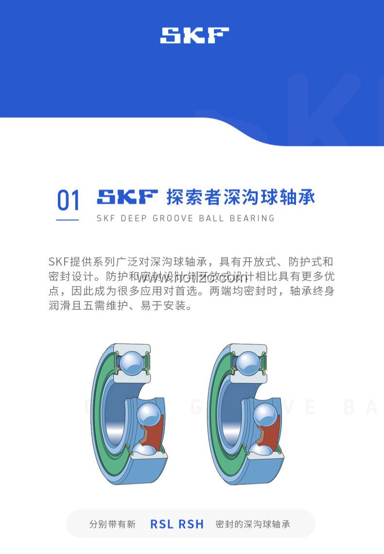 • SKF深溝球軸承是一種儀器器件,有開式、雙面帶密封圈,帶密封的軸承在外圈上開有可裝密封圈或防塵蓋的溝槽,適用于高轉速甚至極高轉速的運行。